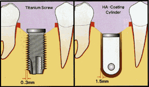 また、インプラントを埋入する穴とインプラント本体の間に0.3mmの隙間があると、チタン製インプラントだと結合する可能性は低いのですが、HAコーティングインプラントだと0.3mmはおろか、1.5mm以上の隙間があっても骨結合するのです。